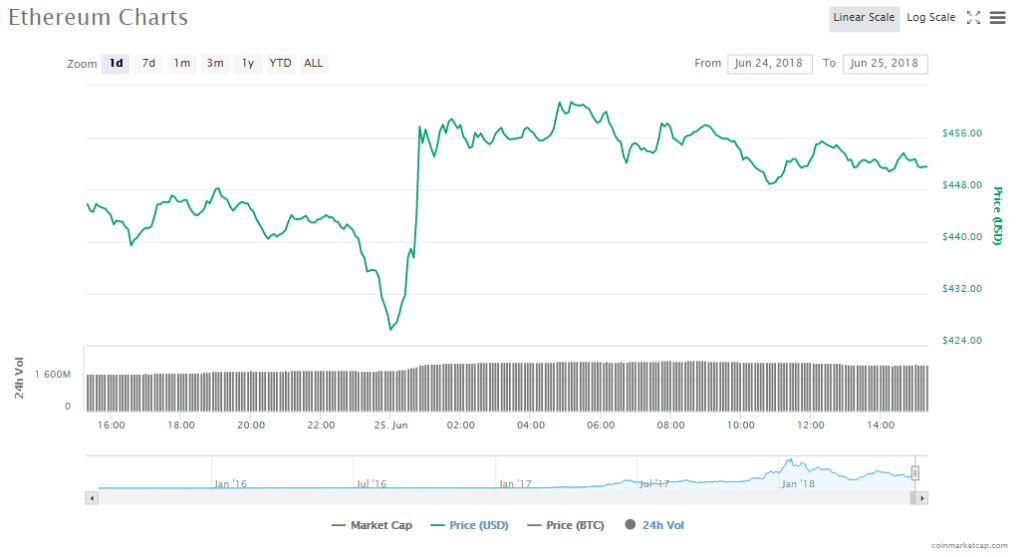 Ethereum’s price went up by 1.28% to $451.54 since yesterday. ETH’s volume of trade is currently $2.28 billion and its market value is $45.23 billion.