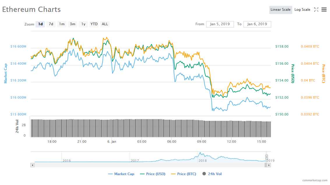 Ethereum’s price fell 3.14% to trade at $152.47. As for the altcoin’s trading volume, it reached $3.03 billion; whereas its market capitalization hit $15.89 billion.