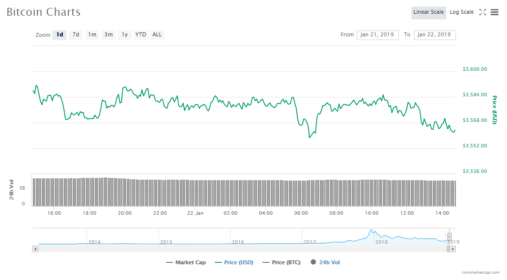 - Bitcoin’s price is $3564.68, slipping by 0.69%. The cryptocurrency is now valued at $62.36 billion.