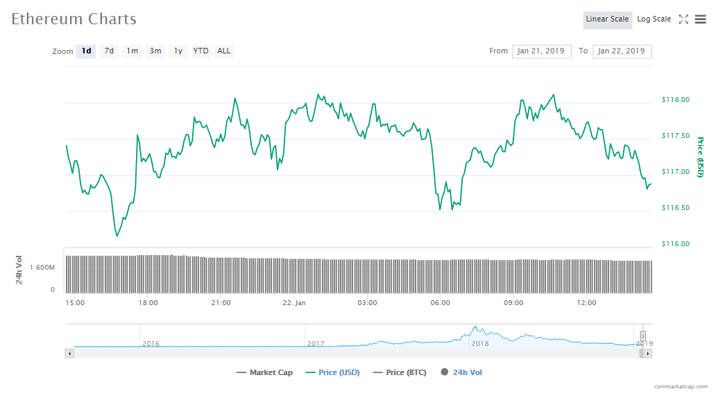 Ether’s price is now $116.97, slipping 0.06% in the last 24 hours. Its capitalization in the market is $12.22 billion and trade volumes are at $2.30 billion.