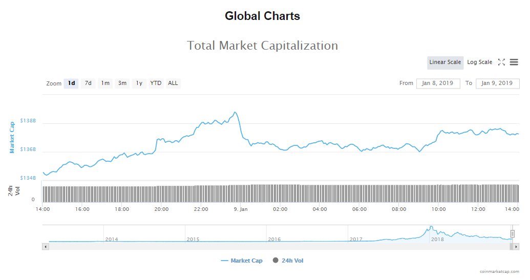 The capitalization of the crypto market is up by almost $2 billion to $137 billion since yesterday and trading volumes have shot up to $25.54 billion.