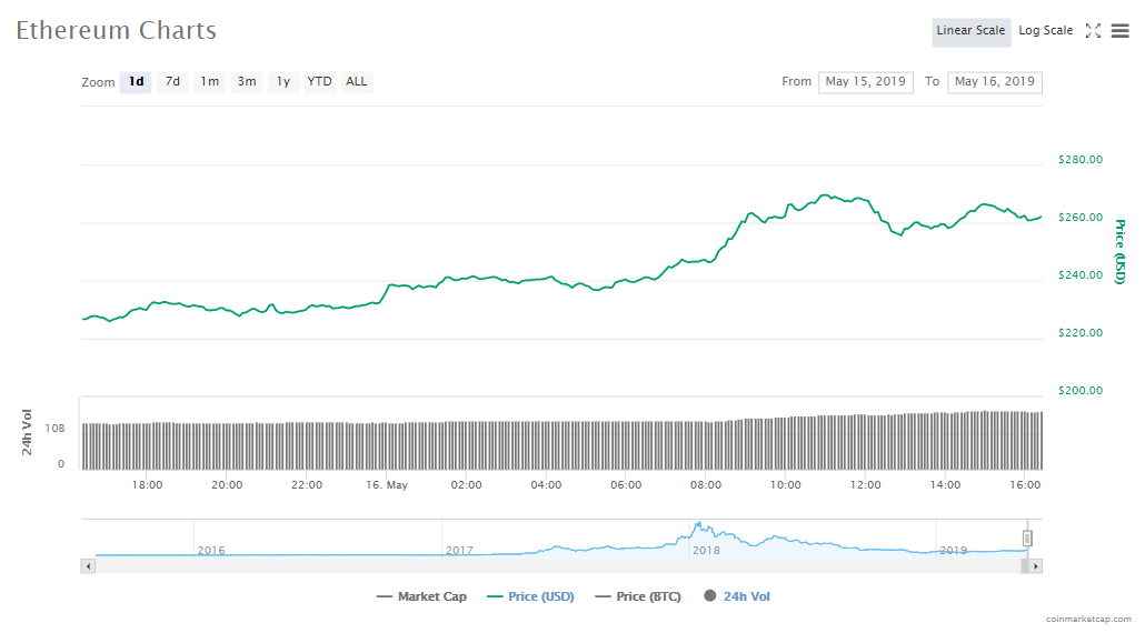 The price of Ethereum continues to shoot up, gaining 15.78% in the last 24 hours, to trade at $263.10. Trading volumes are at $16.12 billion and the crypto’s capitalization is now $27.91 billion.