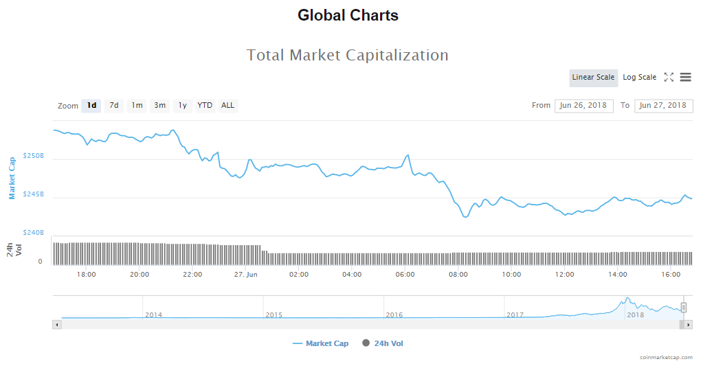 Trading volume has dropped since yesterday to $11.10 billion. The cryptocurrency market’s capitalization plunged in the last 24 hours to $245.25 billion.