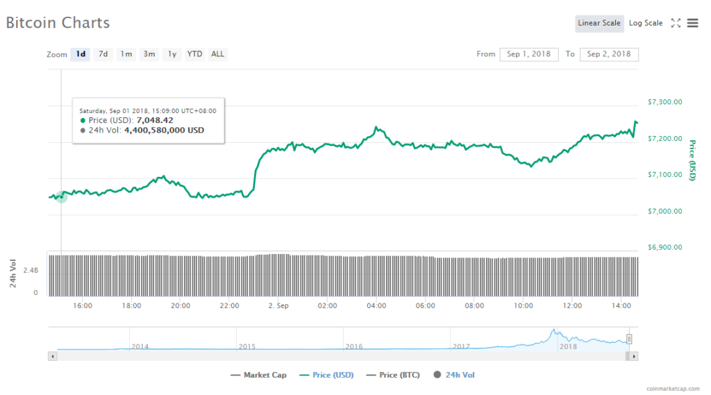 In the past 24 hours, Bitcoin jumped 2.27% to trade at $7,216.79. The leading cryptocurrency’s trade volume trickled to $4.21 billion, while its market slid to $124.45 billion.