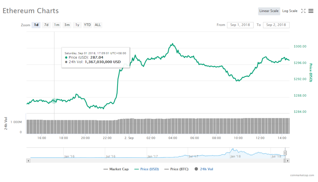 Ethereum’s price jumped 3.42% to trade at $296.37. As for the altcoin’s trading volume, it reached $1.56 billion; whereas its market capitalization hit $30.14 billion.