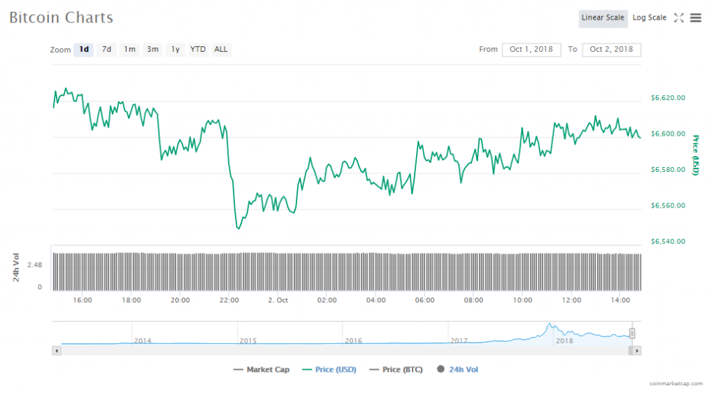 Bitcoin’s price is now $6599.53, losing 0.26% since yesterday. Bitcoin’s value is $114.26 billion and volumes in trade are $3.96 billion.