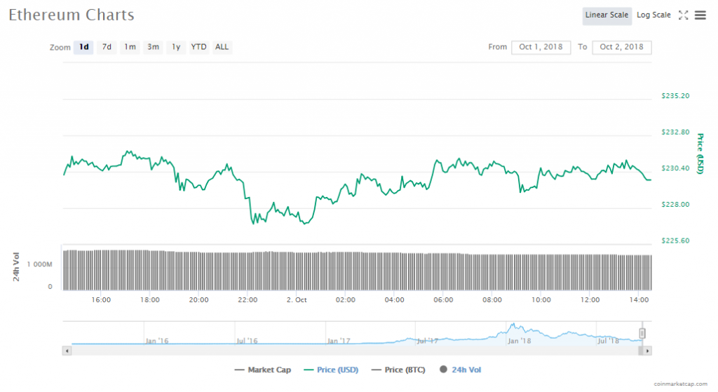 Ethereum’s price is $229.86, dropping by 0.51% since yesterday. Ethereum’s market value at this point is $23.53 billion and its trading volumes are currently at $1.55 billion.