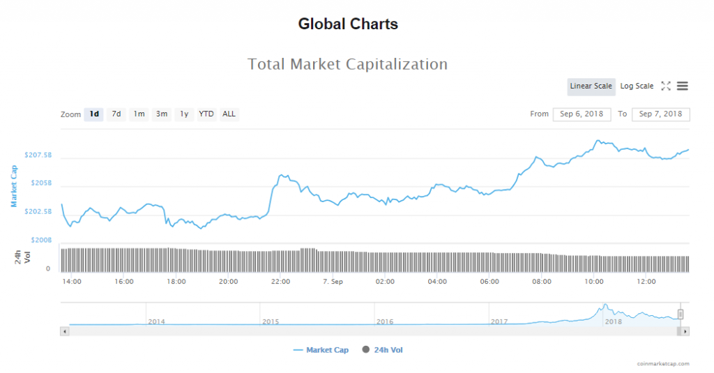 The volume of trade in the cryptocurrency market has dropped by $6.28 billion to $13.80 billion since yesterday’s rout. The market’s valuation has also stabilized since yesterday, going up by $4.31 billion to $208.43 billion.