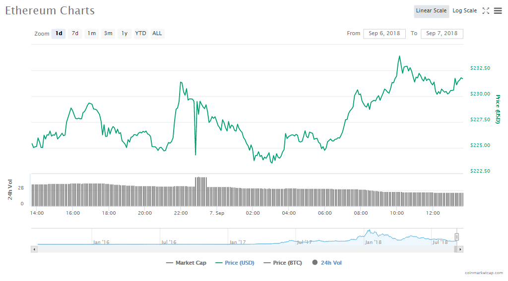 Ethereum is now trading at $231.70, a 1.10% gain since yesterday. Ether’s market value is $23.60 billion and its volumes of trade are at $1.71 billion.
