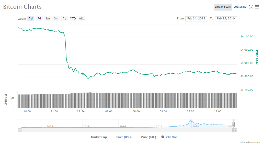 Dropping by a massive 8.01%, the price of the world’s most valuable cryptocurrency, Bitcoin, is now at $3836.29 per token. The worth of the crypto has dropped to $67.35 billion in the last 24 hours and trading volumes are at $10.78 billion.
