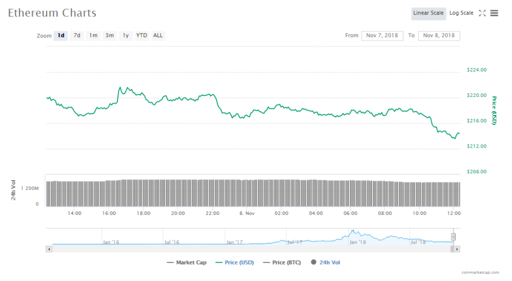Ethereum has fallen 2.41% to a price of $214.29in the last one day. The crypto’s market worth is $22.08 billion and its volumes in trade are at $1.83 billion.