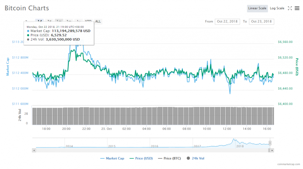 In the past 24 hours, Bitcoin fell 0.03% to trade at $6,483.63. The leading cryptocurrency’s trade volume trickled to $3.66 billion, while its market slid to $112.41 billion.