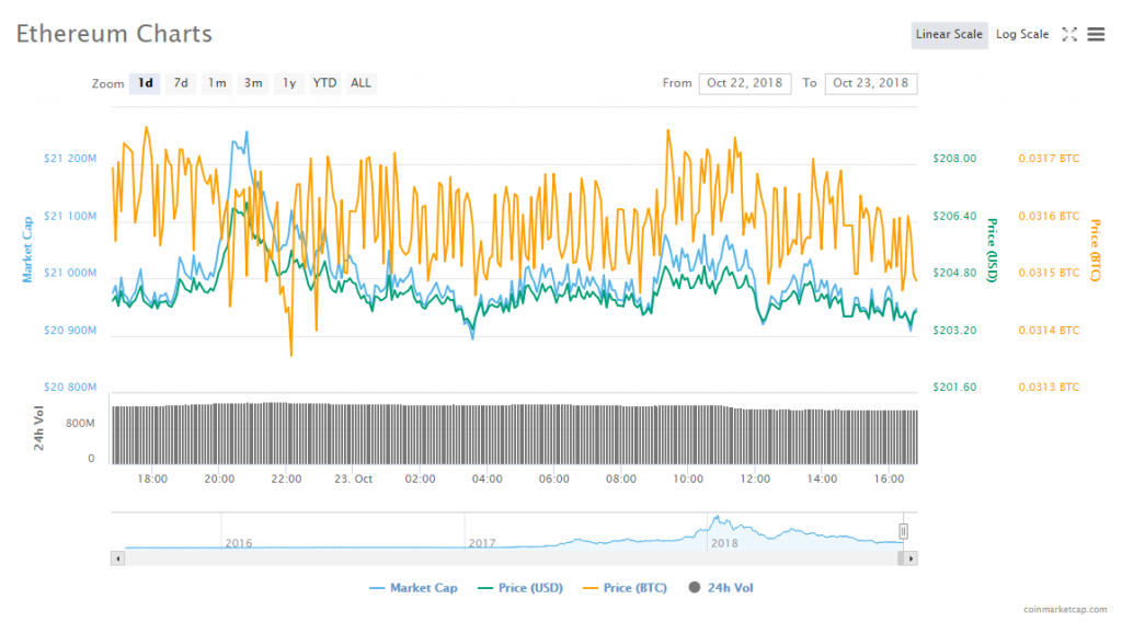 Ethereum’s price fell 0.44% to trade at $203.64. As for the altcoin’s trading volume, it reached $1.22 billion; whereas its market capitalization hit $20.92 billion.
