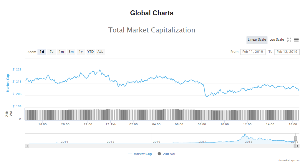 The gentle slide downwards continues for the cryptocurrency market, with capitalization dropping to $120.35 billion in the last 24 hours. Trade volumes in the market are now $19.98 billion.