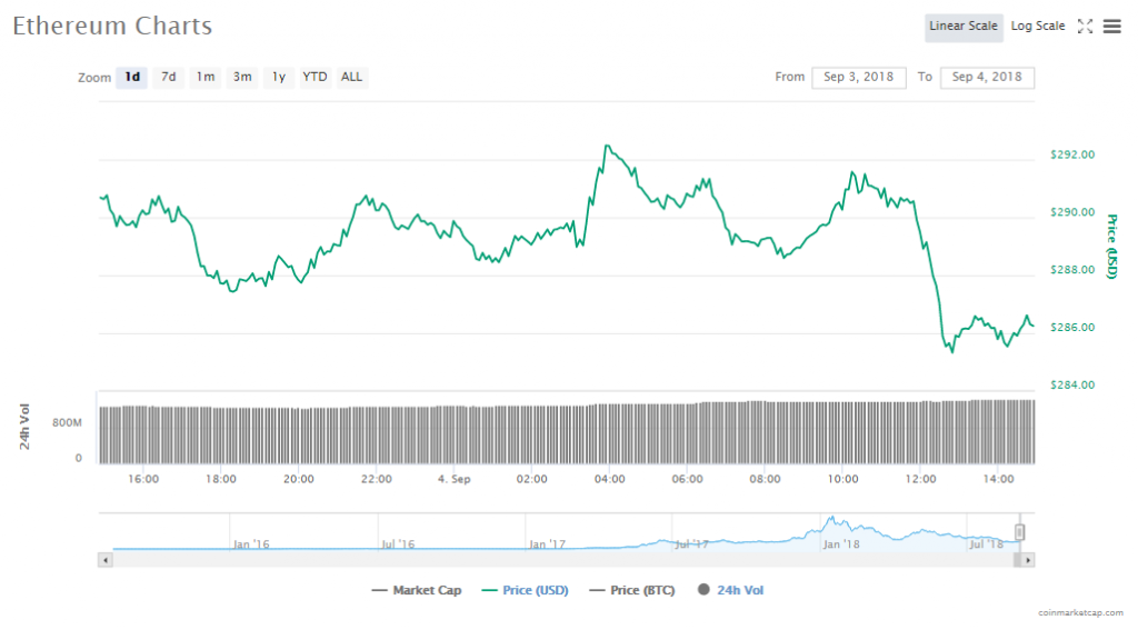 Ethereum’s price is now at $286.25, a 1.43% loss since yesterday. Ether’s market value is $29.16 billion on trade volumes of $1.42 billion.