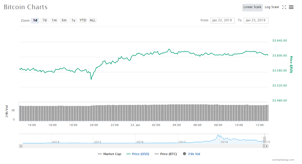 - Bitcoin’s price is $3601.47, going up 0.85%. The current market value of the virtual currency is $63.02 billion.