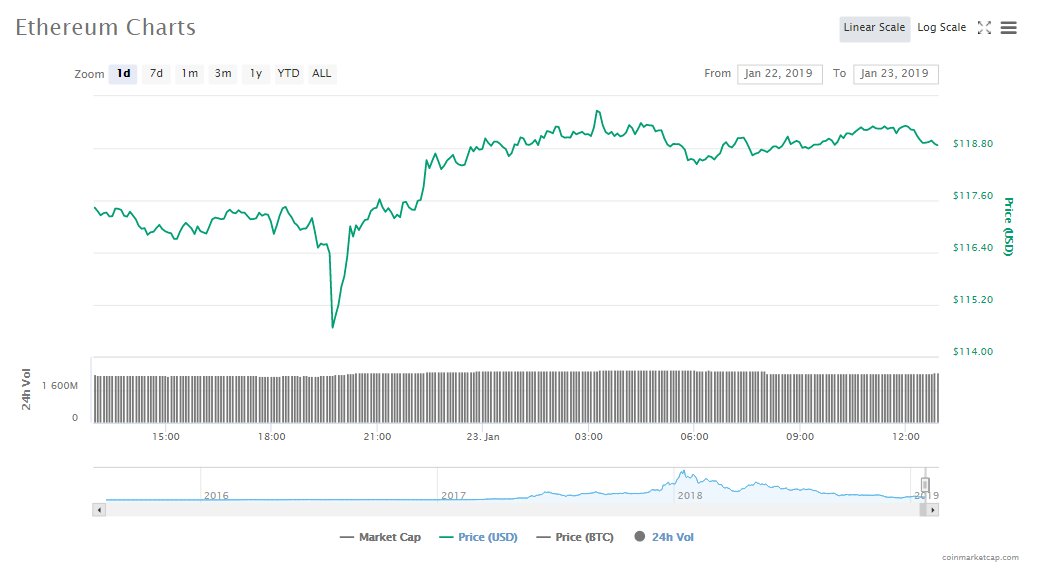 Ethereum’s current price is $118.89, which is 1.27% higher that its price the same time yesterday. The altcoin is experiencing trade volumes of $2.43 billion and its valuation is $12.42 billion.