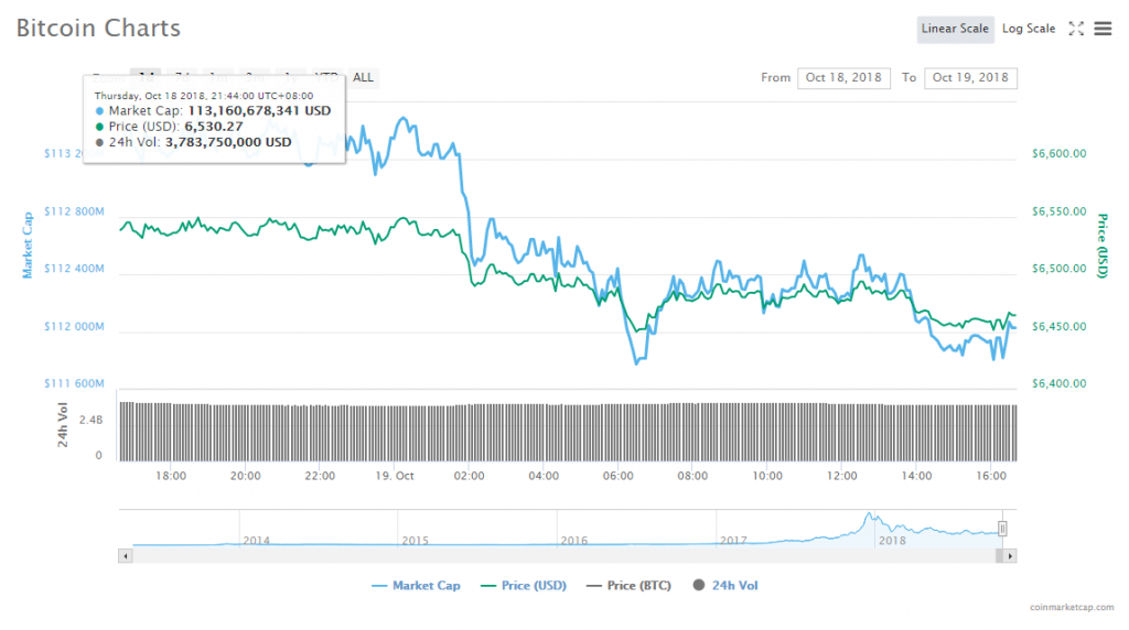 In the past 24 hours, Bitcoin fell 1.18% to trade at $6,465.11. The leading cryptocurrency’s trade volume trickled to $3.84 billion, while its market slid to $112.04 billion.