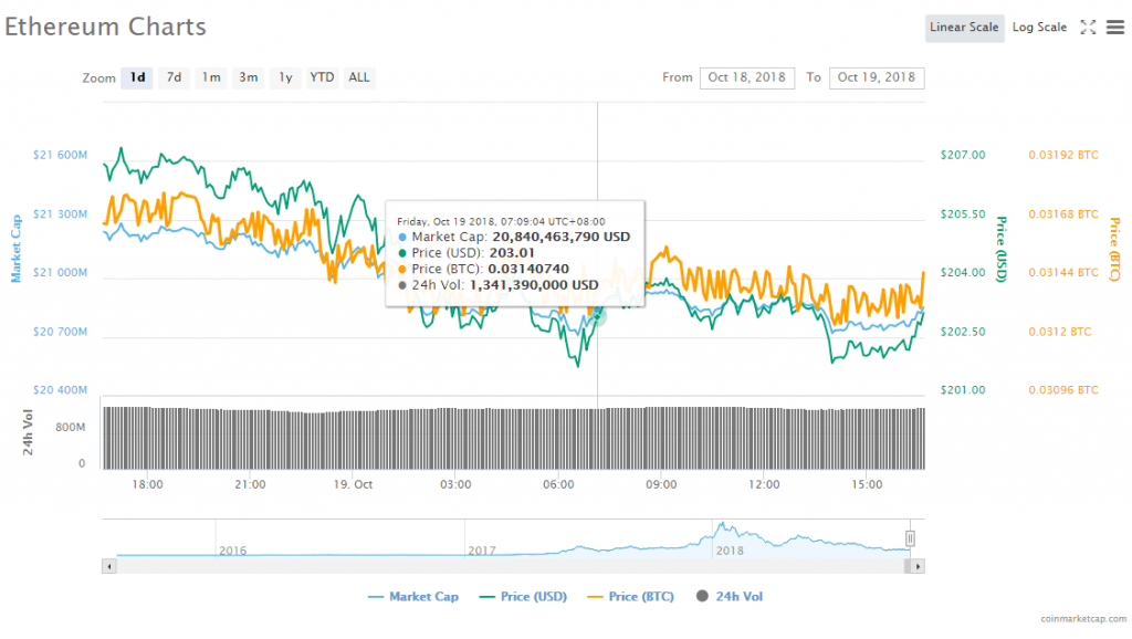 Ethereum’s price fell 2.13% to trade at $202.71. As for the altcoin’s trading volume, it reached $1.35 billion; whereas its market capitalization hit $20.81 billion.