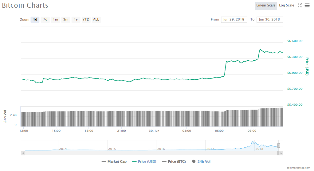 The Bitcoin price surged 7.90% to $6406.30 per token in trading today. The crypto’s trading volume also went up to $4.51 billion and its value in the market increased to $109.56 billion.