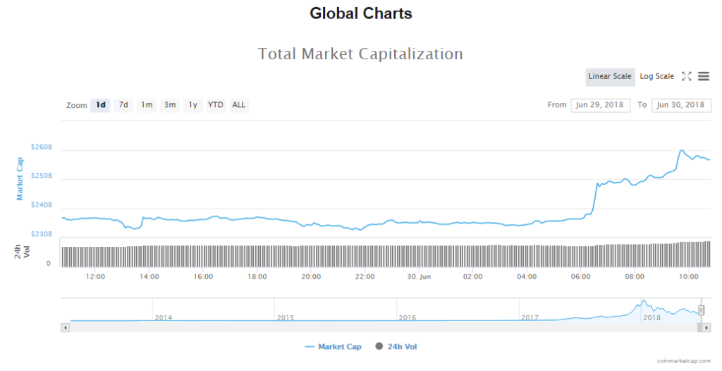 After being called a “bloodbath” by mainstream media, the cryptocurrency market has seen an upward swing in trading today. The market capitalization has gone up to $256.13 billion while trading volume shot up from yesterday’s $10 billion to $14.11 billion today.