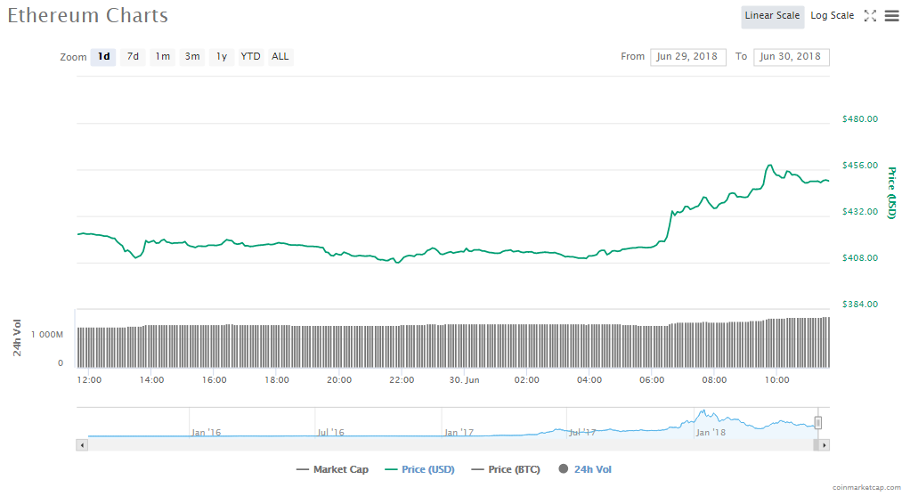 ETH also saw a price surge of 7.79% to currently trade at $450.22. Ethereum’s trading volume has gone up to $1.74 billion and its market value is currently $45.05 billion.
