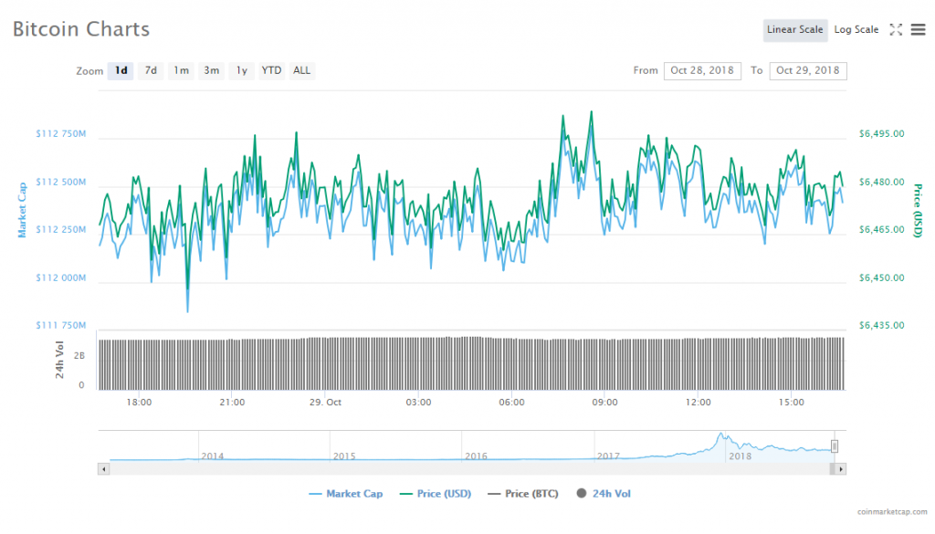 In the past 24 hours, Bitcoin jumped 0.01% to trade at $6,477.66. The leading cryptocurrency’s trade volume trickled to $3.55 billion, while its market slid to $112.37 billion.