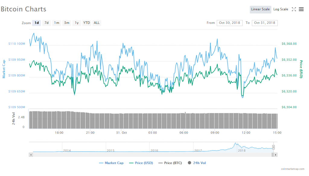 - Bitcoin’s market price fell 0.19% to $6,336.48, and its value in the market is $109.95 billion.