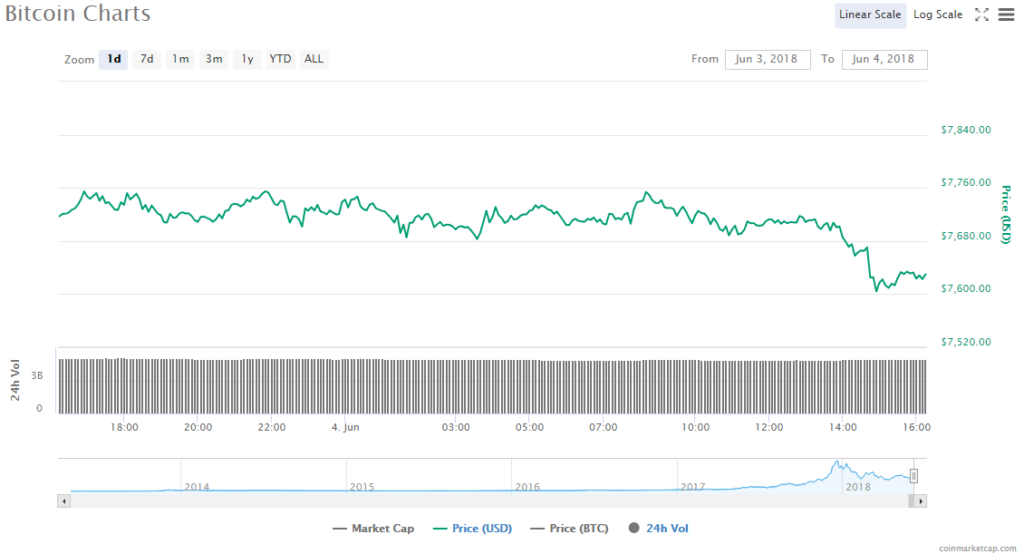 • Bitcoin’s price dropped 1.13% to $7629.75 and its market value is $130.06 billion.
