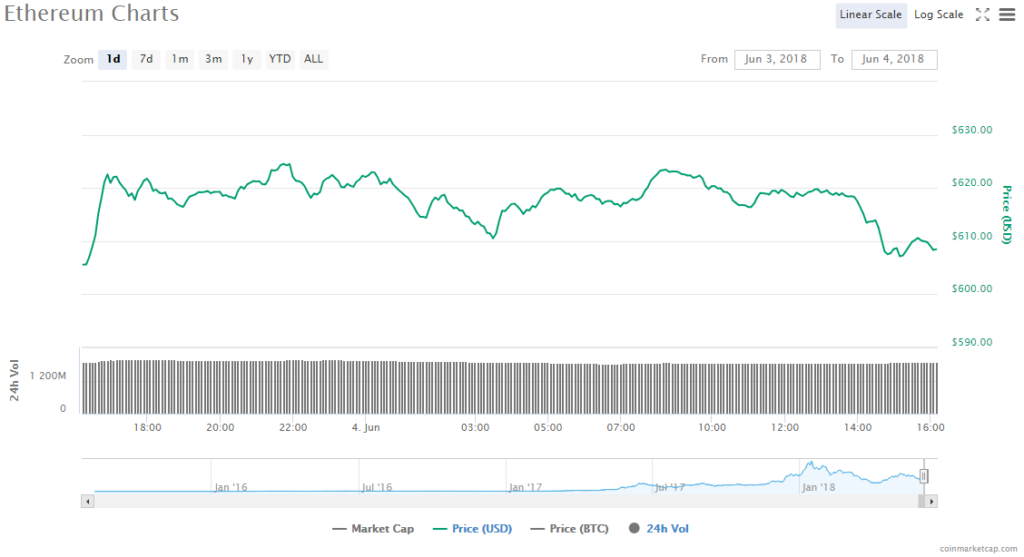 Ethereum gained 0.47% to trade at $608.47 in the past 24 hours. Trading volume for ETH is $1.86 billion and market value for ETH is $60.56 billion.