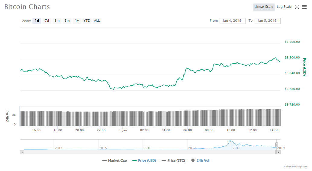 Bitcoin’s price gained 0.70% in the last 24 hours to trade at its current price of $3878.36. The digital asset’s value in the market is now $67.73 billion and is trading at volumes of $5.16 billion.
