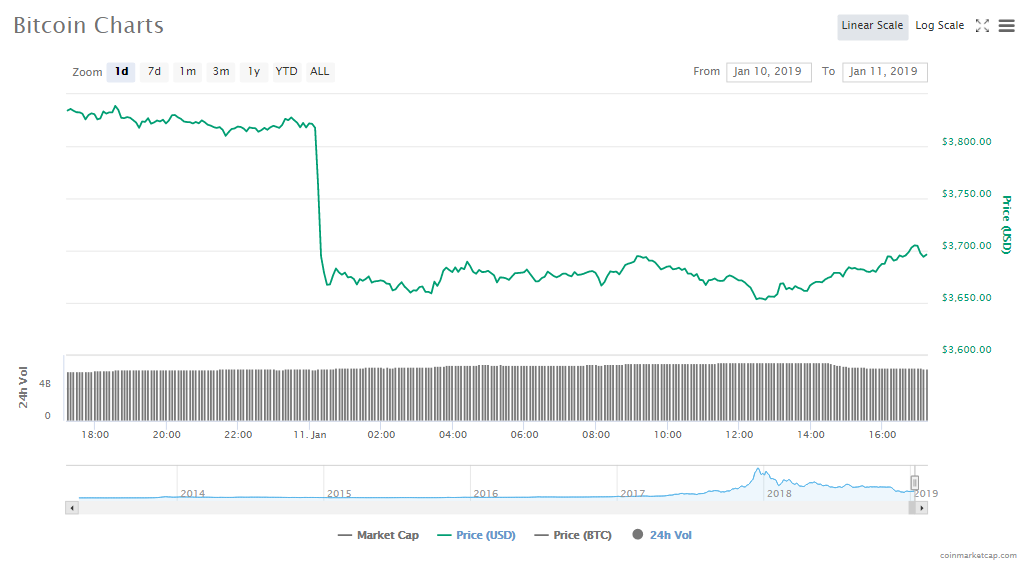 - Bitcoin’s price is $3702.03, dropping 3.58%. The market valuation of the digital asset is $64.69 billion.