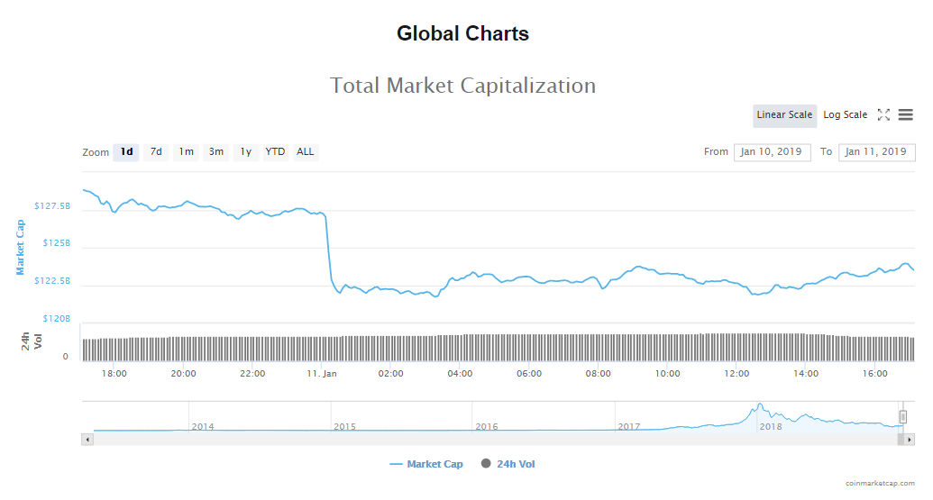 The crypto market is seeing its second straight day of losses, with its capitalization down to $123.78 in the last 24 hours. The volume of trading is up to $20.53 billion.