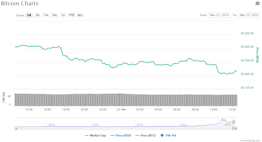 - Bitcoin is trading at $8497.07, a 6.24% slide. The virtual currency’s market value is $143.62 billion.