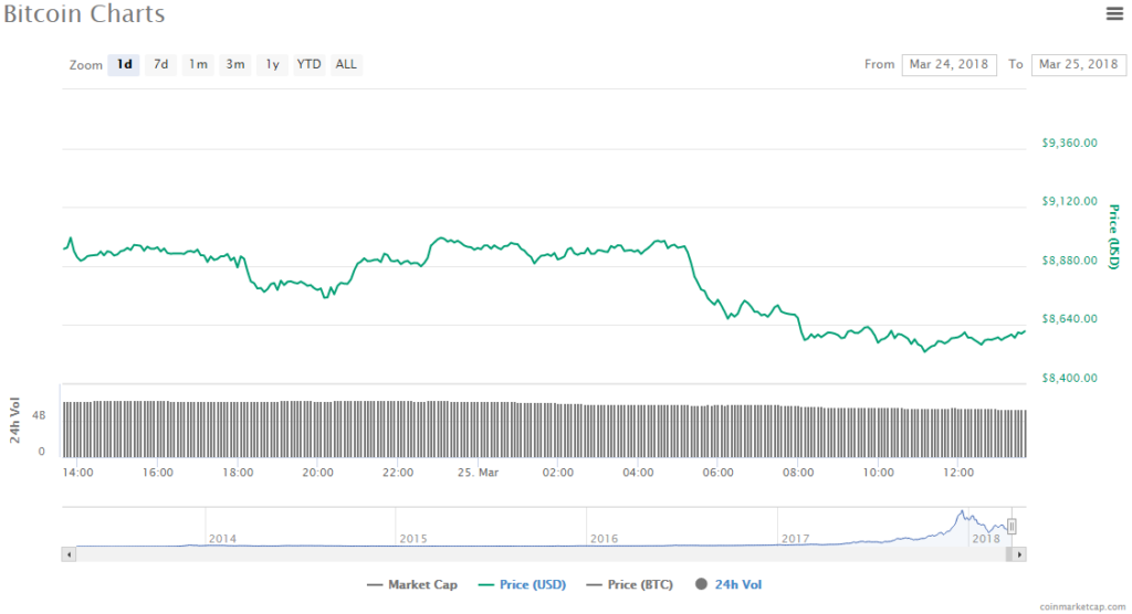 - Bitcoin’s trading price is currently $8614.32, which is a drop of 3.61%. The market cap is $145.89 billion.