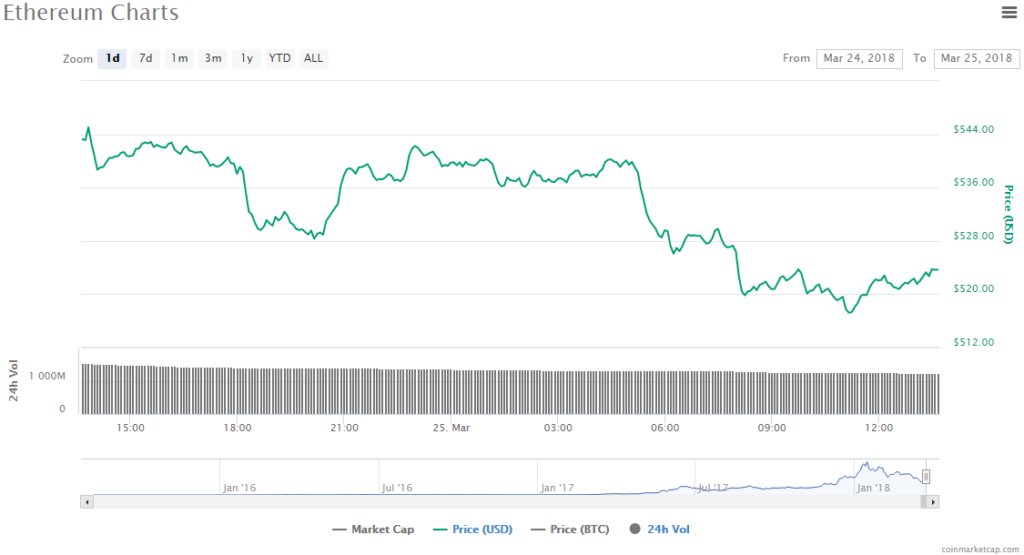 - Ethereum’s trading price is currently $523.69, which is a drop of 3.33%. The market cap is $51.51 billion.