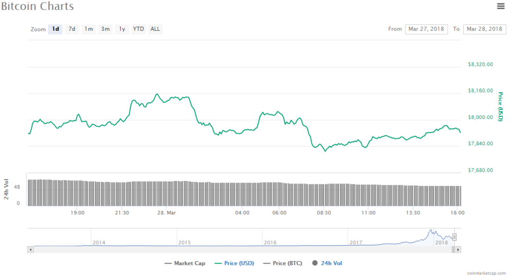 • Bitcoin’s market price is currently $7923.27, with a gain of 0.06%. Its market value is $134.29 billion.