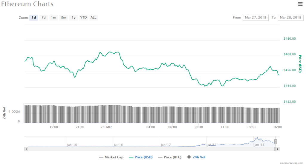 • Ethereum’s market price is currently $453.41, with a drop of 2.45%. Its market value is $44.65 billion.