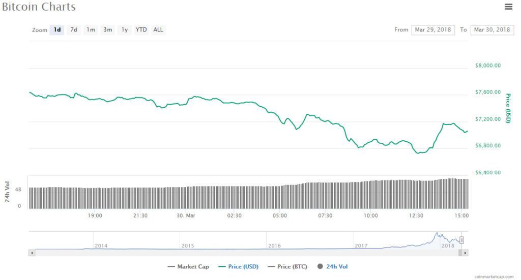 Bitcoin dropped by 10.65% to trade at a price of $7059.04 since yesterday. Trading volume was up to $7.2 billion, but the cryptocurrency’s market value is down even more at $120.73 billion.