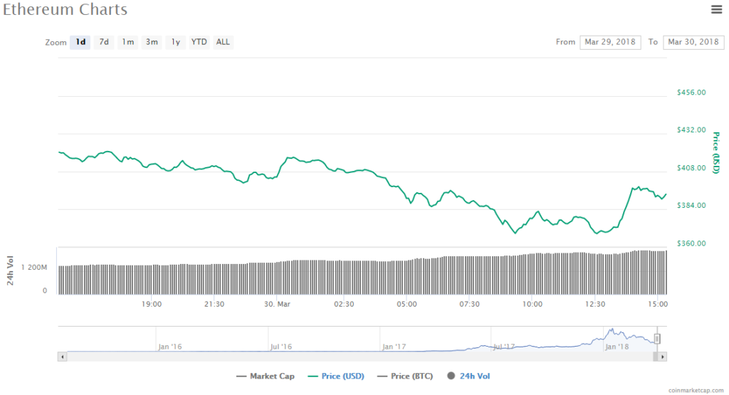Ethereum price has dropped below the $400 mark for the first time since November 2017, and is now trading at $393.61, which is a 7.57% drop in the last 24 hours. The crypto’s market value is now $39.13 billion and has a trading volume of $2.25 billion.