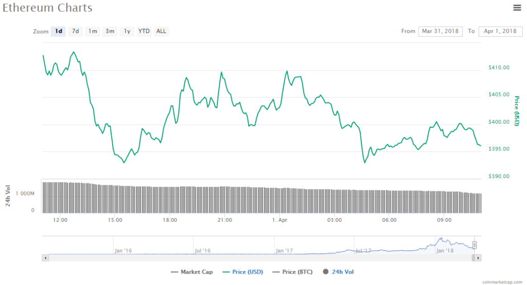 Ethereum’s price inched up by another 0.27% to trade at a $396.01 in the last one day. Trading volume dropped even lower to $1.17 billion. Ethereum’s market value was at $39.02 billion.