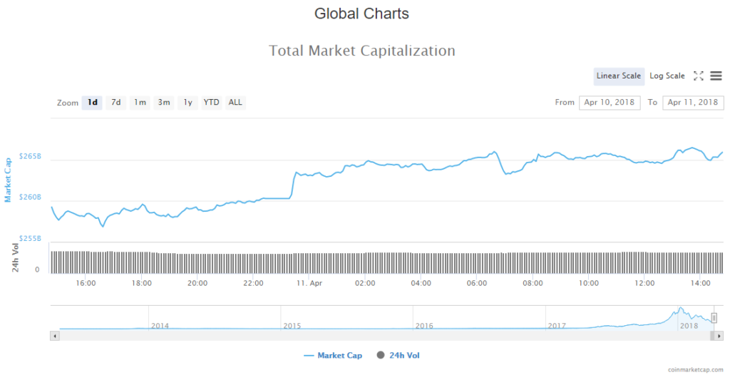 Trading volume for the last 24 hours remains around the same at $11.16 billion, while the crypto market’s capitalization inched up again to touch $265.80 billion.