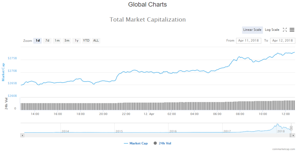 The last 24 hours have been good for the cryptocurrency market. Trading volume finally turned upward to $15.63 billion and market capitalization went up to $276.99 billion.