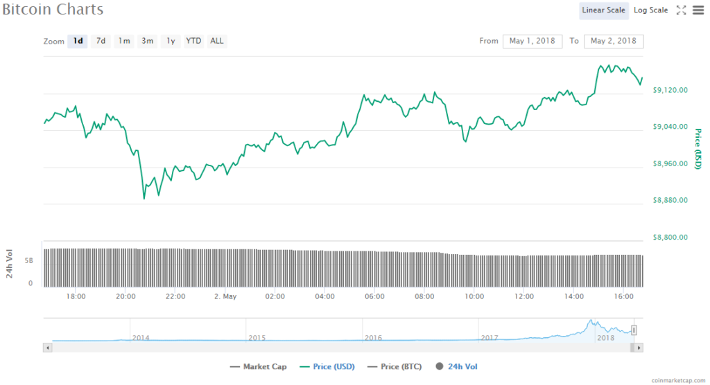 Bitcoin’s token price inched up by 1.78% to trade at $9154.22 in the last twenty-four hours. The cryptocurrency’s trade volume slipped down to $7.04 billion. However, BTC’s market capitalization rose to $155.63 billion.