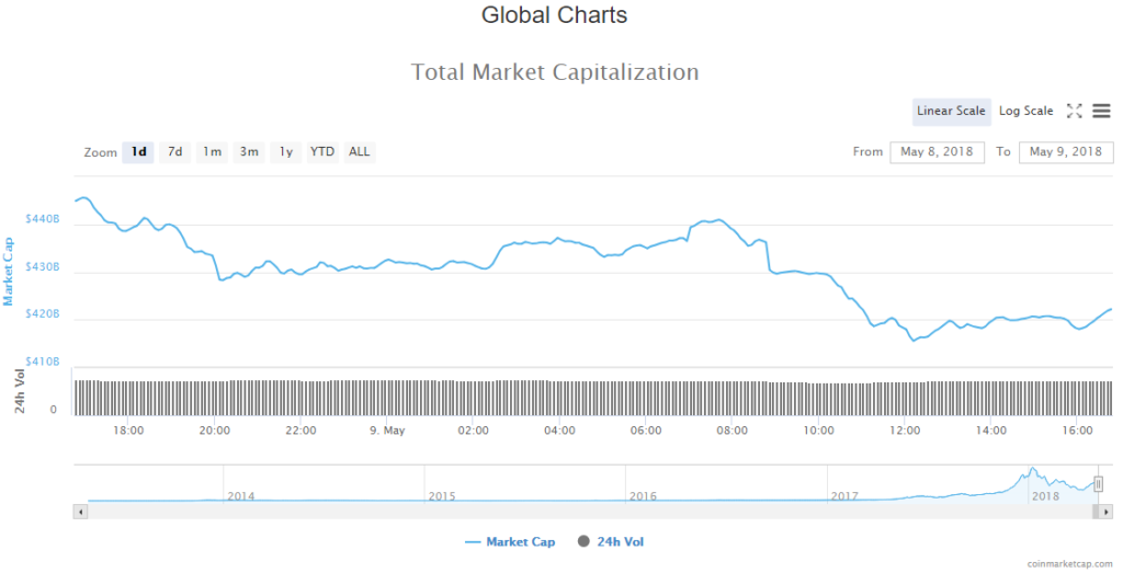 The cryptocurrency market trading volume has slid again to $23.28 billion. Market capitalization has also dropped in the last 24 hours to $422.75 billion.