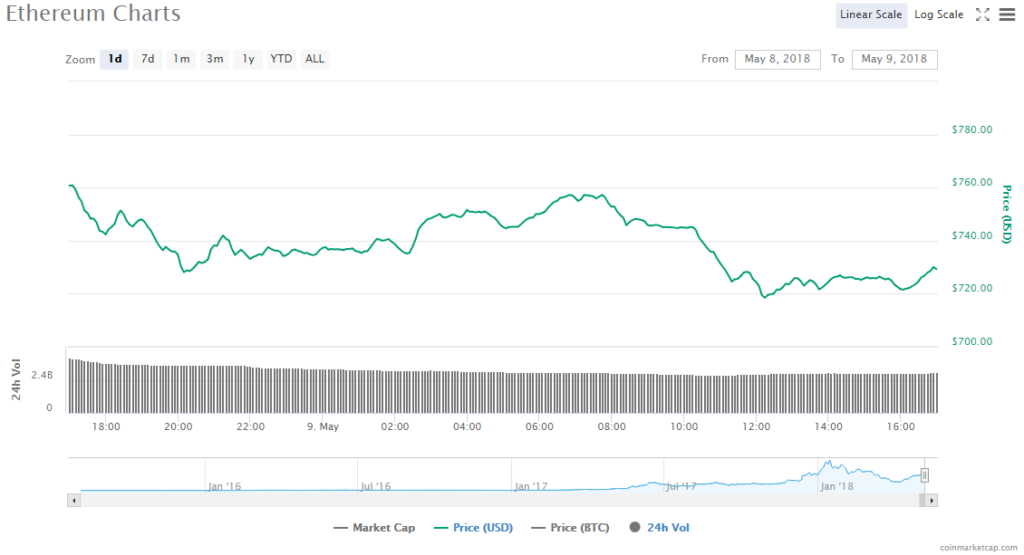 Ethereum’s token price fell by 5.17% to trade at $729.28 in the last twenty four hours. The virtual coin’s trading volume is now $2.93 billion and its market value is at $72.59 billion.
