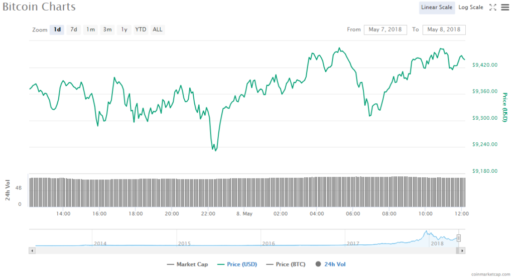 • Bitcoin experienced a price increase of 0.7% to $9437.56 and its market cap went up to $160.62 billion.