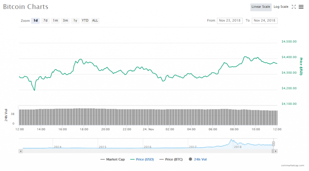 The price of Bitcoin is currently trading up by 2.34% at $4368.79 per token. The capitalization of BTC is now $75.97 and trading volumes are at $4.48 billion.