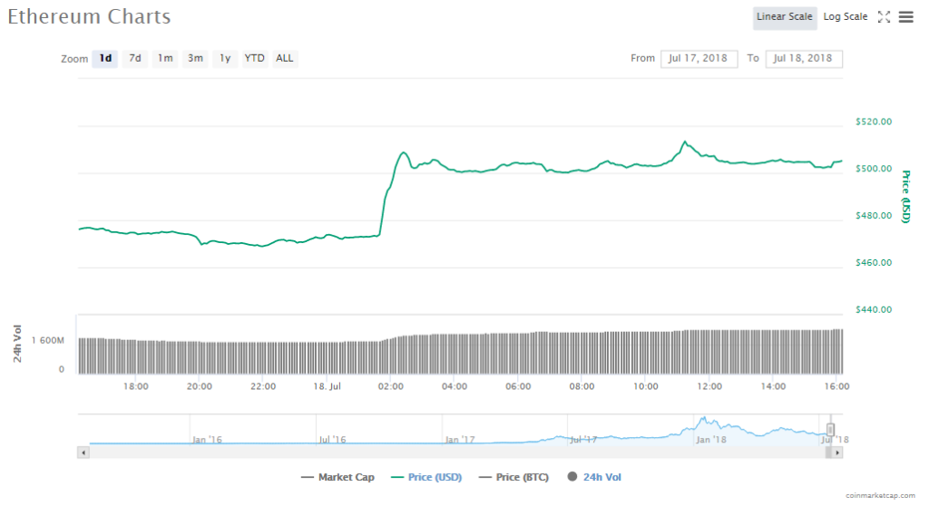 Ethereum’s price jumped by 6.63% to trade at $505.11 per token. The altcoin’s current trading volume is $2.43 billion and its valuation is now $50.71 billion.