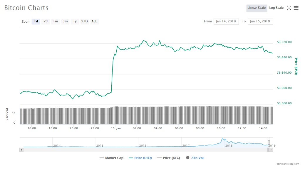 Bitcoin has seen a 2.99% rally in its price in the last 24 hours and is currently trading at $3696.89 per token. Its market capitalization has risen to $64.63 billion and trading volumes are $5.52 billion.